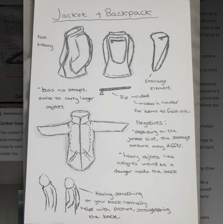 For this task we were assigned to create our own Chindogu ideas and illustrations. These ideas was influenced from researching different images from Pinterest and the web to get a solid understanding of how to form the product. My idea was to merge the 2 objects, a jacket and a backpack together to create a arms free storage unit with ease. Its designed so there’s no straps to the product making it less irritating for the user to move around and easier to carry larger objects. By putting items with the back unit, it should also help out to straighten the back improving posture. The down side to this product would be depending on the size of the jacket because the storage amount would differ. To improve on this task I would of had to create more of a useless side to this product making it fit into the the Chindogu category.