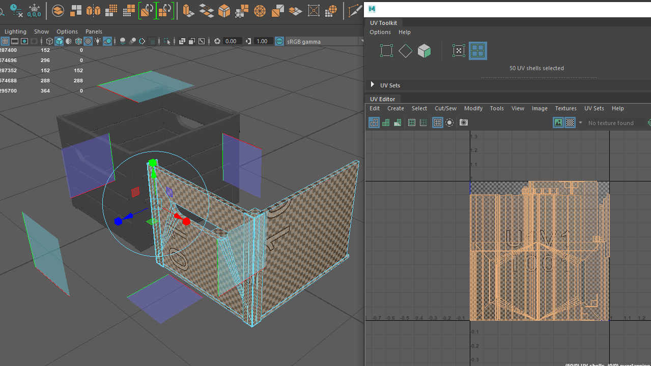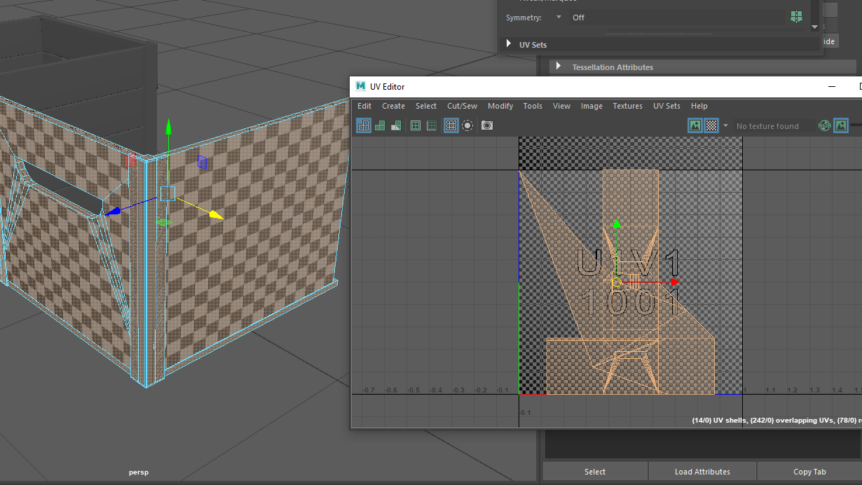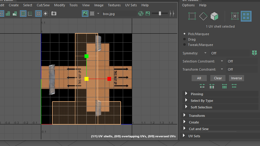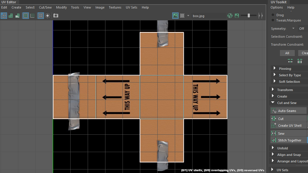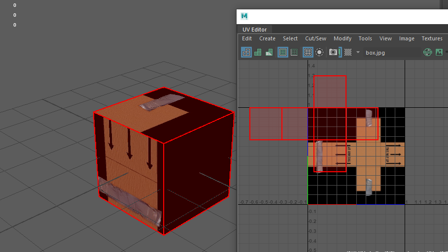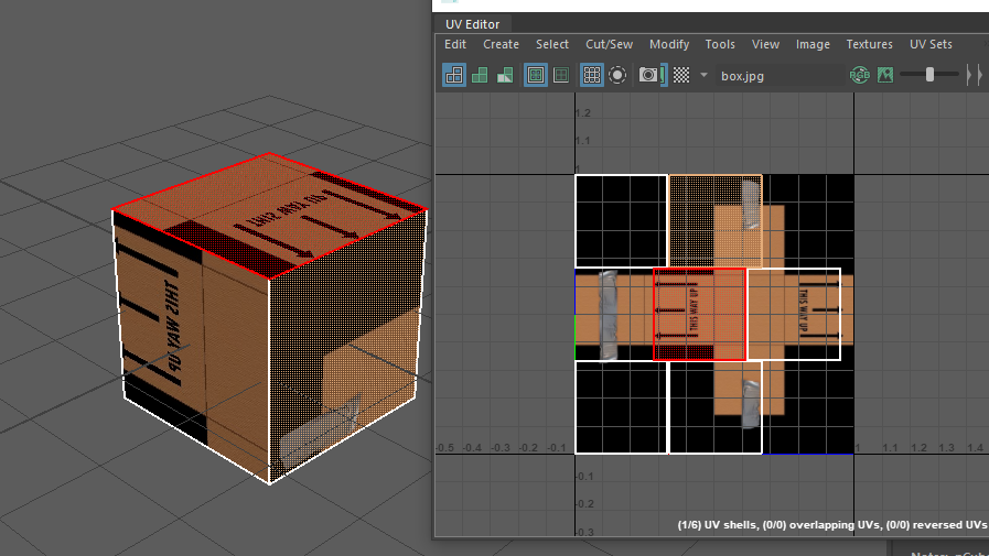 Now opening UV editor I could see the box textures net and the faces of the cube. The faces here was mapped out incorrectly so I began to break them up and rearrange them.