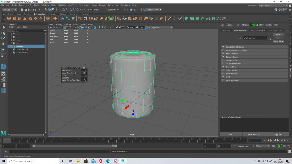 First added a poly cylinder to the surface, creating edge loops around the top and the bottom of the shape. By doing this I was trying to achieve more of a round edge of the can like I’ve seen but in order to get the top and bottom correctly I had the extrude slightly.
