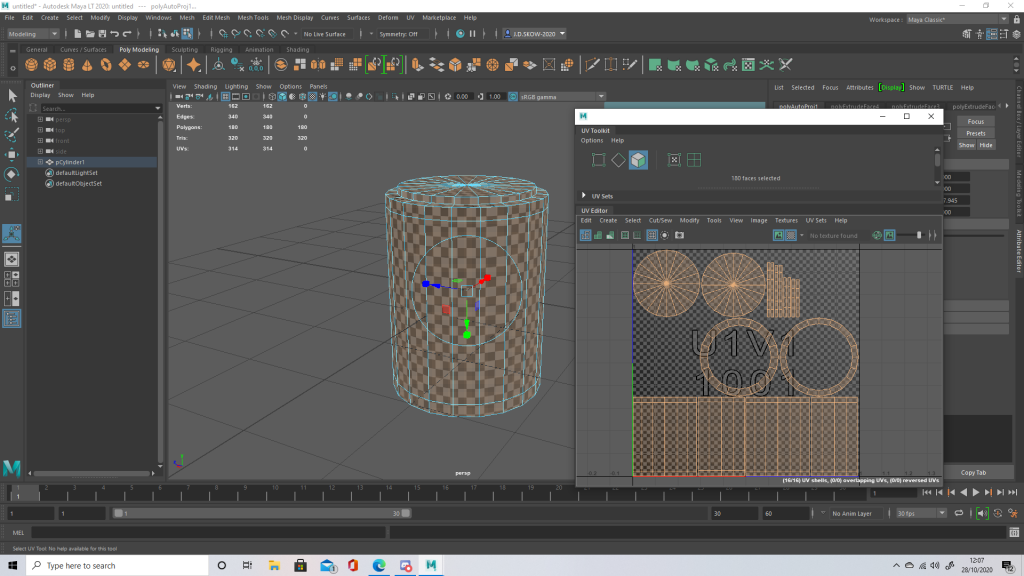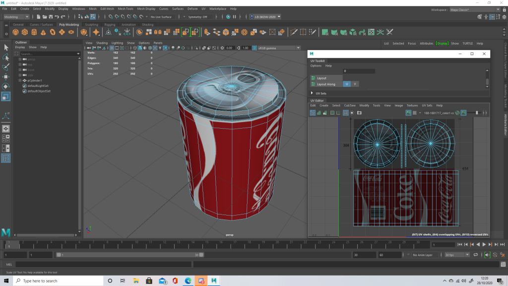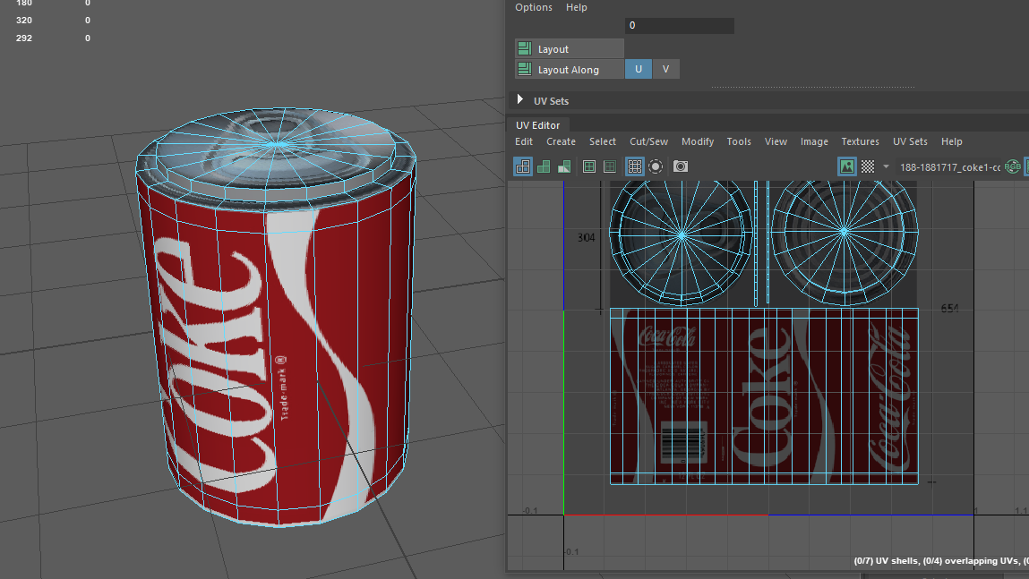 After gaining the rough shape of the can I started to create the UV Map. The faces on the map were all organised with the layout tool, this gave a gap of 10 pixels between each shape. The top and bottom extruded points were disconnected loops at first however so i simple stitched them up so texturing would be easier.