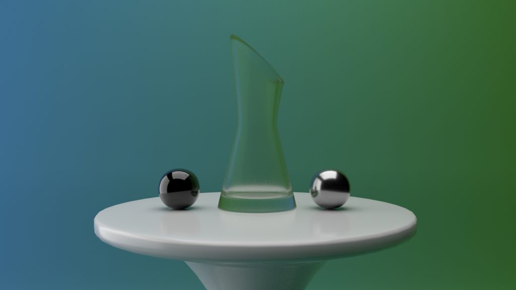 After I began to add the textures to the models. First I started with the metal balls on the table, one looking chrome and the other metallic. This was done by adding a new surface material and changing the colours slightly. To create the vase I had to do the same steps but change the weight of the object making it more transparent like glass, this took a while as i had to experiment with the shades of the colours so it wouldn’t lose its shape overall.