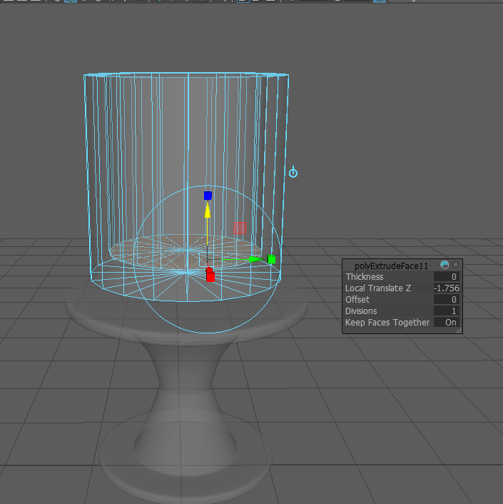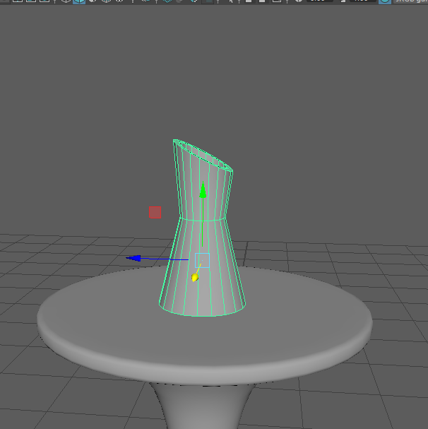 Once the table was made I began to construct a vase out of another cylinder poly. I extruded the top of the cylinder creating an edge within and then selected the faces of that loop to extrude down. It was difficult to gain the accurate position of inner loop at first so I enabled x ray mode for this as seen below.