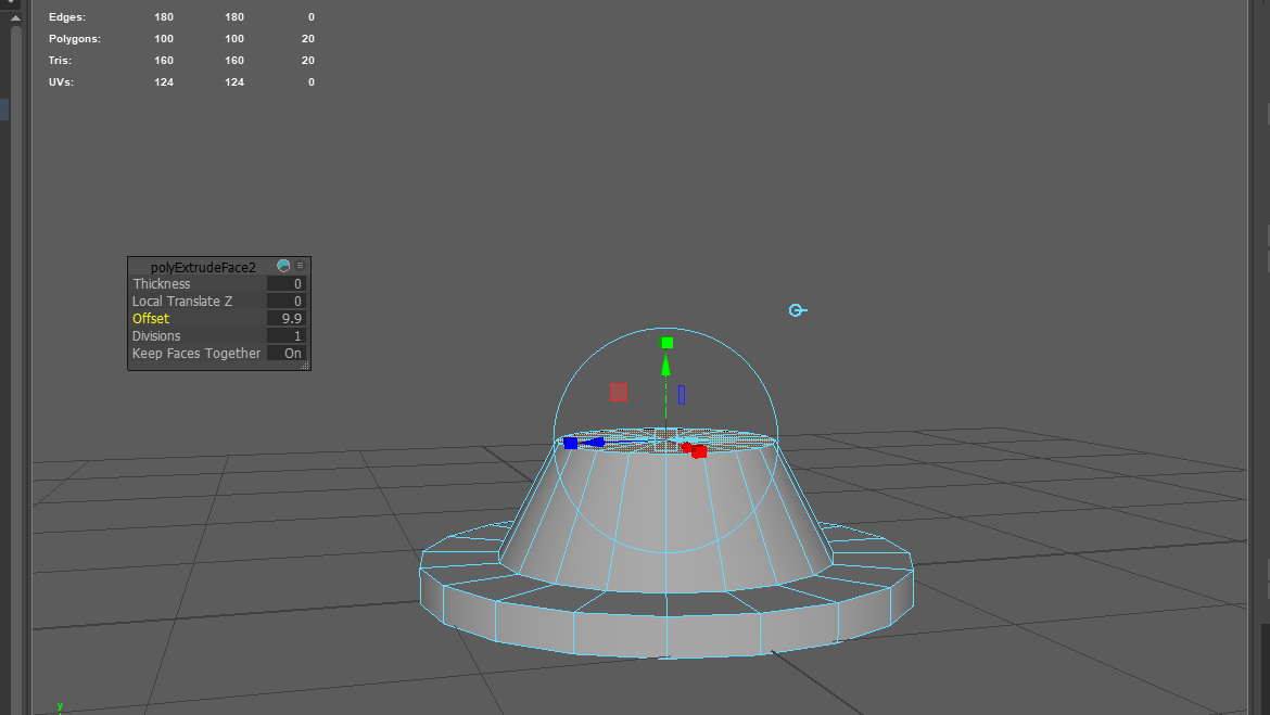 After I was happy with the right size of the bottom, I began to extrude the inner faces. This started by making the correct positioned offset for the bottom disk and then extruded those faces upwards, scaling them as slopes to create the shape that I was after.