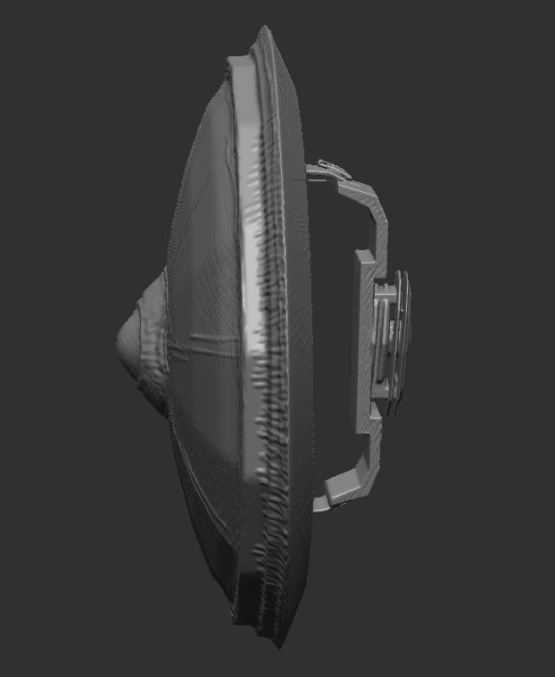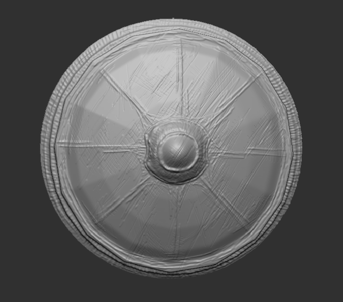 Finally, once I was happy with the shape, I DynaMeshed the model and began to bring the shield to life. A quick smooth brushstroke was needed to help clear most areas, complemented by the inflate tool to add an extra curve. Clay build up tool was then used to add and subtract areas of the model defining dints in the shield and producing smaller worn details.