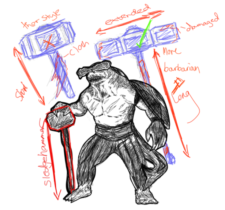 I wanted the hammer to be sturdy and tough like the character itself so I looked into different styles with materials of hammers and found the perfect match in mind. This visual of a long crafted stone sledgehammer was found while researching, I like the way it’s been assembled with the markings along the edges, when adding detail to mine I shall make fairly similar adjustments but alter it slightly to have a more damaged and dirty appearance.