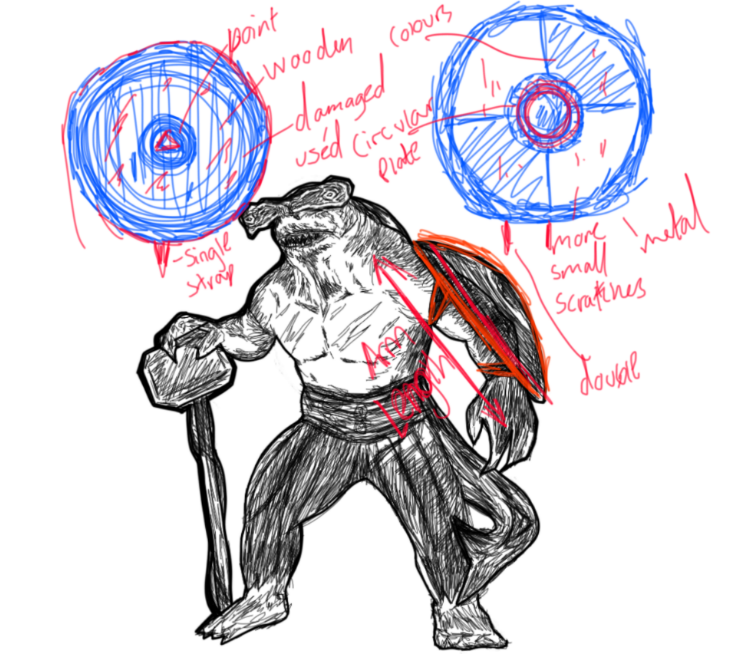 Moving onto the next asset, a Shield for the character. I tackled this design fairly similar to the last by generating a mini mind map of sketches around the character to see which would best fit. 2 different types of biking shields come to mind when sketching, one being wooden and worn, with the other having metallic elements and colour.