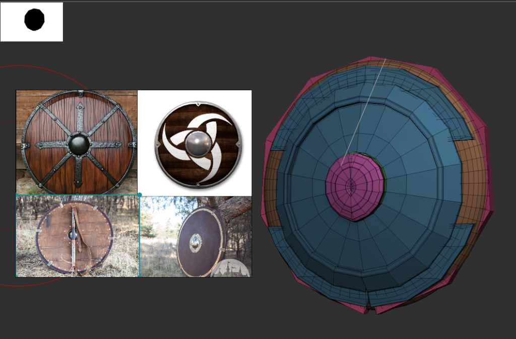 In the end, I decided to merge both ideas slightly and lean towards creating a wooden shield than a full metal-based, this was because I wanted to be able to show the damage taken more in the asset, with wood broken elements are easier to be defined in my opinion. Also with using a wooden shield there’s more opportunity to add extra detail to the character itself, for example having deeper cuts in certain areas that the shield couldn’t cover.