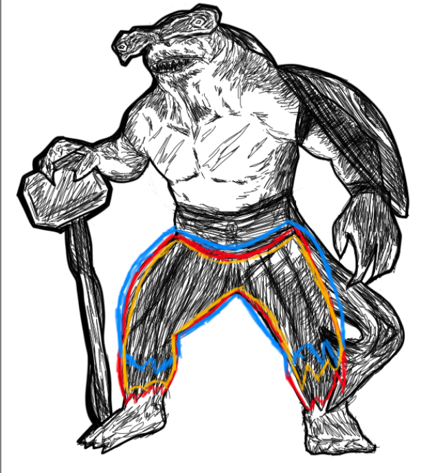 For the trousers, I referred back to my original drawing of the character. I sketched around the area in different colours to show different ways I could tackle or create the form, all of them were similar but differed in size.