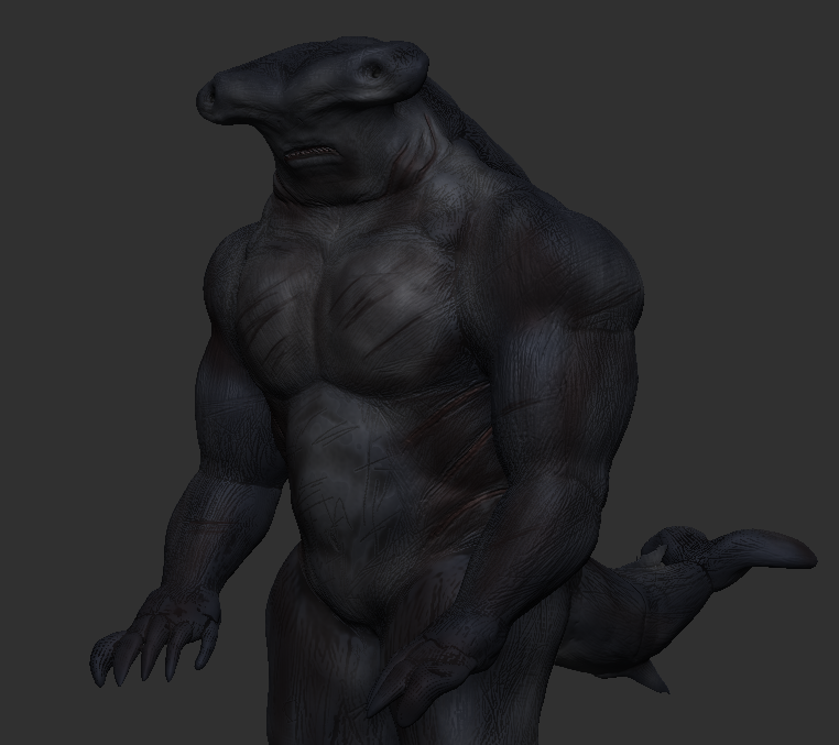 To start I filled this whole model with a layer of navy blue to generate a base coat so I could apply lighter shades more easily blending the colours together. Each layer of colour was sprayed on with a low opacity to help these blends, with the colour being altered every time it creates/builds up the depth of the character with slight highlights in areas. Cavity masking was then used to capture the markings with a dark layer of brown/red scattered along the edges.