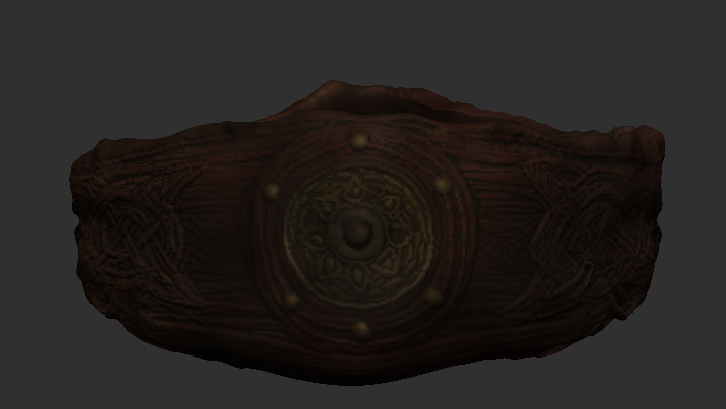 Basecoat, light brown. Colour built up, shades of browns and metallic grey. Cavity, black. Sprayed over with black.