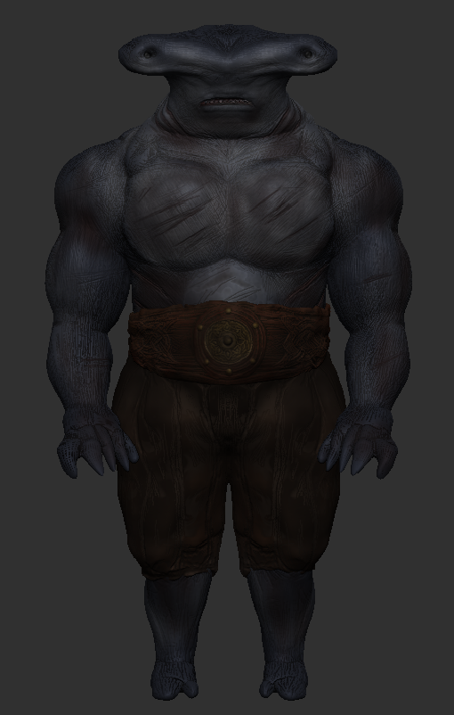 For the clothing and accessories, I used a fairly similar method to the construction of the shark’s body textures. To begin I used the appropriate colour as a base coat and worked up areas harmoniously, then finally cavity mask with a darker layer of colour to define the surface textures.