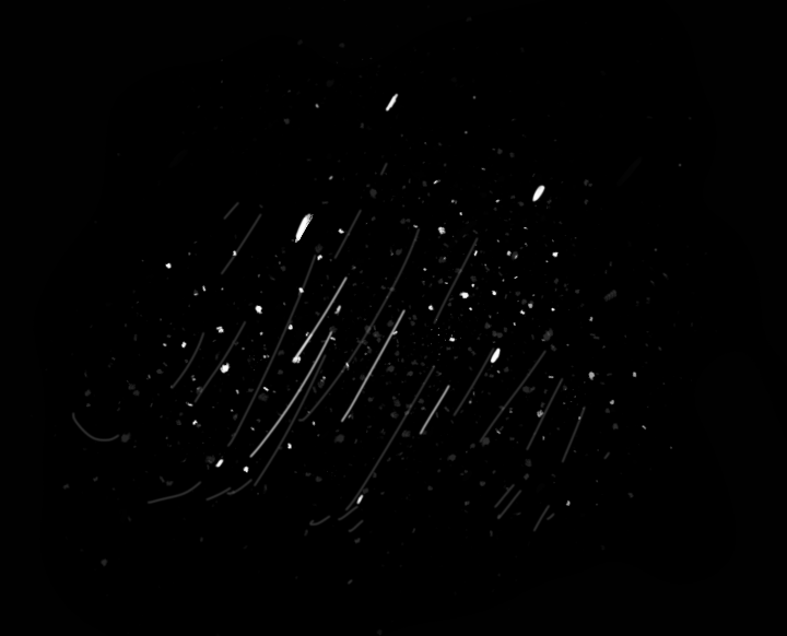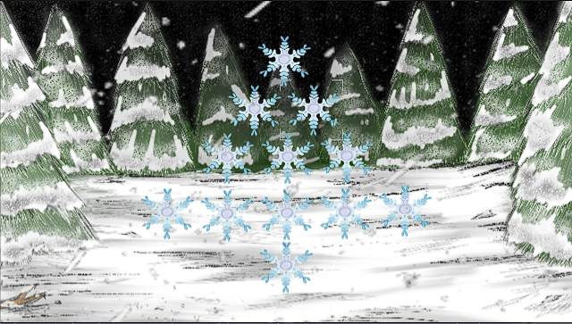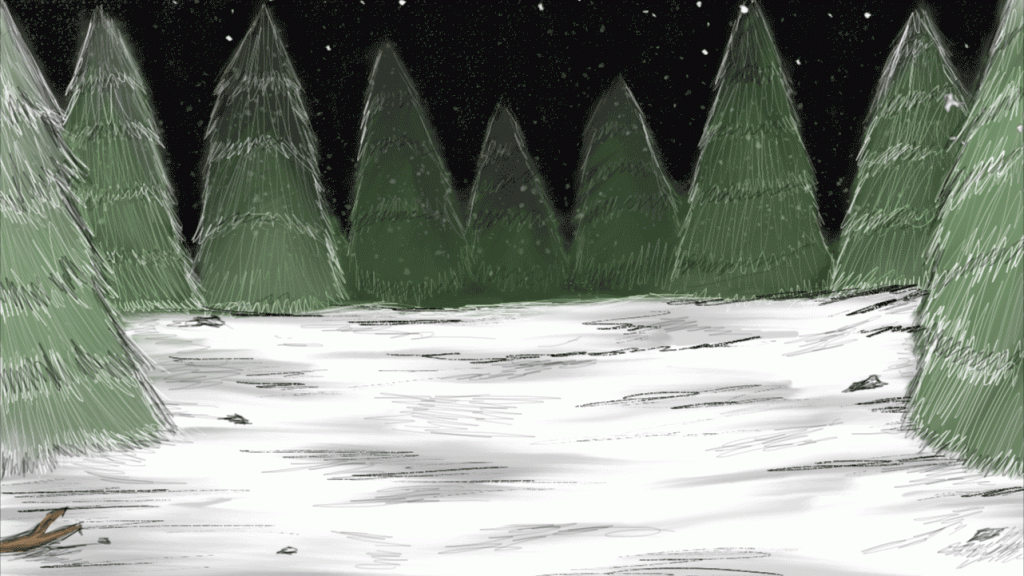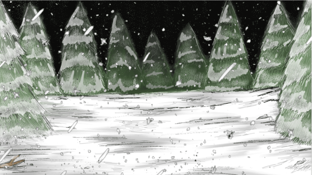 3 layers were generated here, one being the snowfall and the other 2 being the background work. To create the illusion of the flakes building upon the surface of the trees and floor, I duplicated the first visual and applied a coat of snow on areas, once happy I placed it long my animations timeline with a low opacity and make it increase over time.