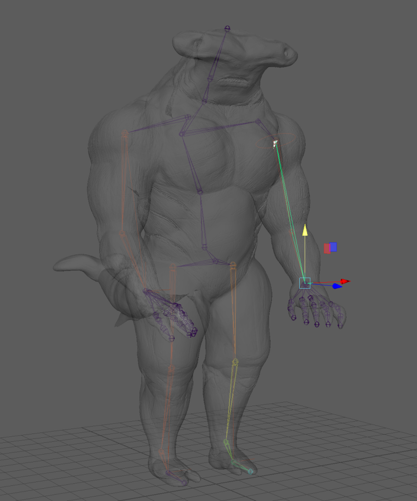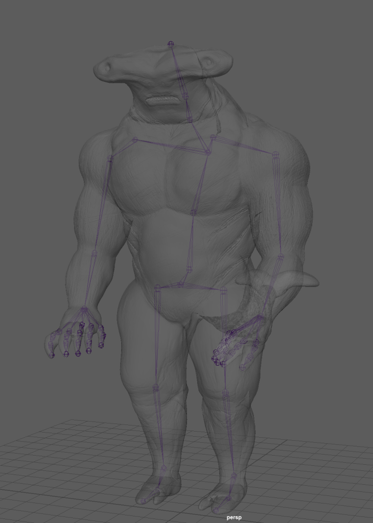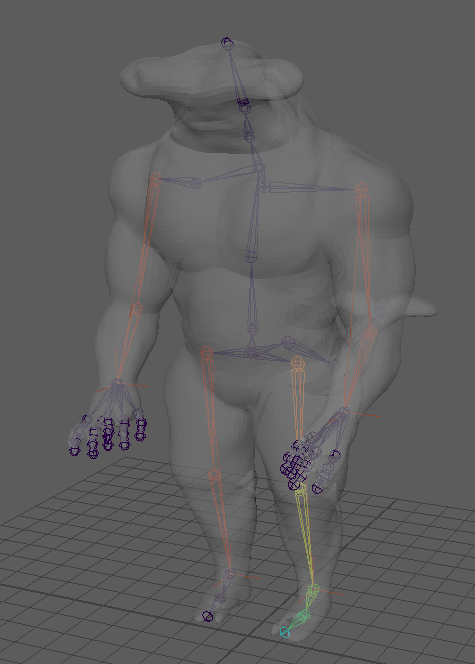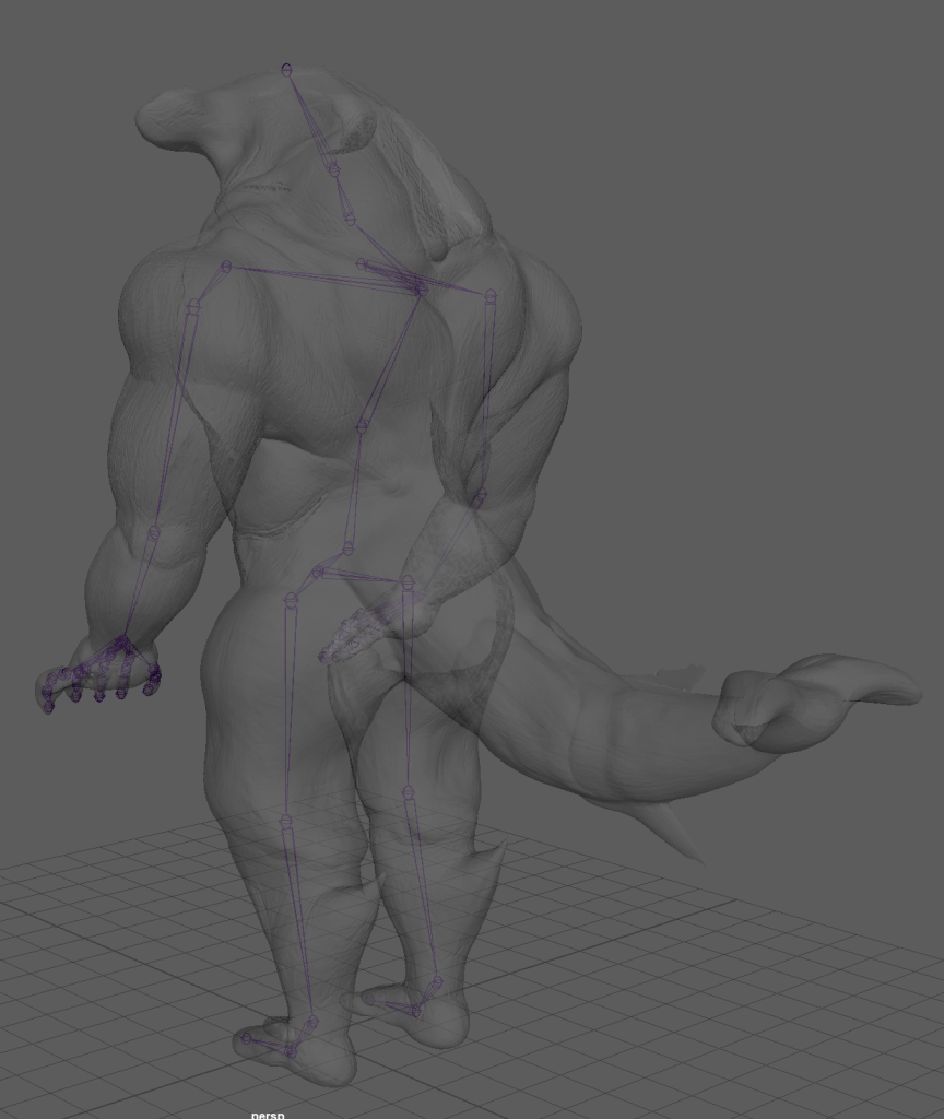 IK handles have been applied to the correct areas such as both arms and legs so the character can bend. Also added to the model at this point, a tail bone has been made.