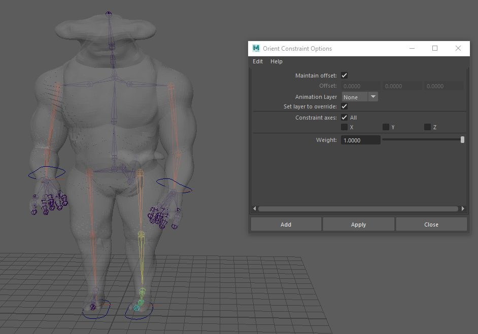 To start I imported the model into Maya and began to create a skeleton using the joints option within the rigging section. To achieve this accurately, I changed and rotated between multiple views to move and reposition each joint to the correct place, e.g elbow to elbow.