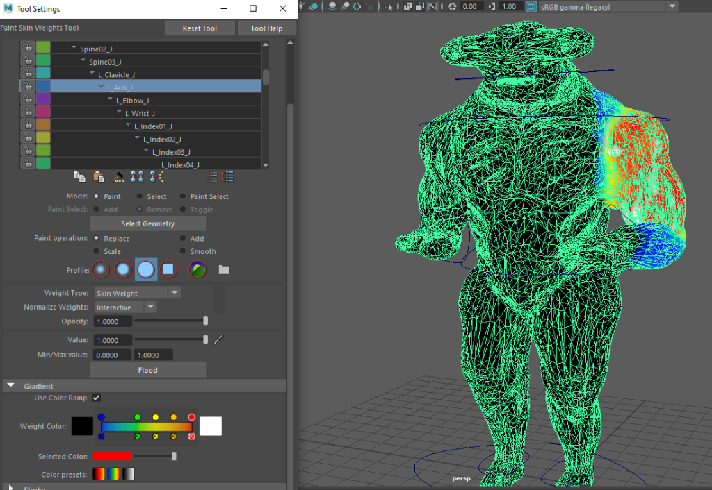 At first, when applying the skin weights I struggled to understand how the different areas were affected by the colour code, my understanding of this became stronger the more I did it. I had a lot of problems when skin weighting with this first model for some reason, my computer and the universities couldn’t handle it so I had to go through the process of remodelling and decimating the model.