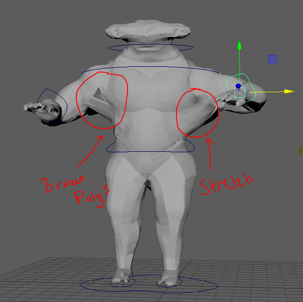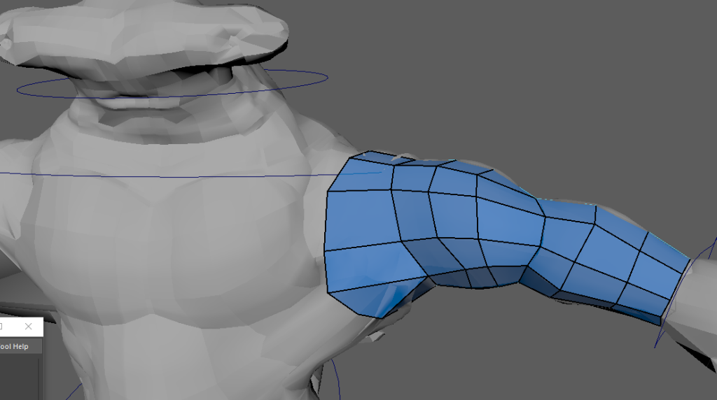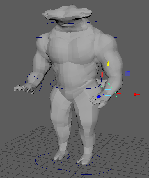 After the IKs were set up to the joints correctly, I began to create all of the controls for the model. These controls were made using wired loops, arranging their points within vertex mode, to fit around the character’s body part.
