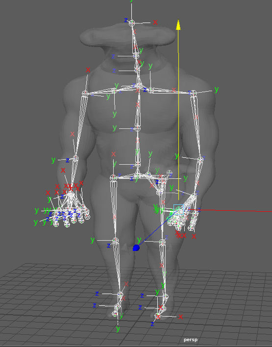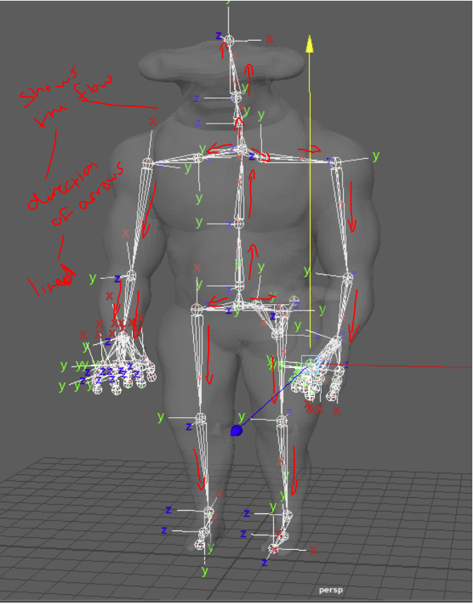 As soon as the joints were parented, I then had to rotate and orientate the joints to create a flow throughout the skeleton of the model. This flow had to have the Z-axis at the bottom of each joint with the Y towards the top, this is important that they are arranged correctly as when you go to move them later on some deformities may occur.