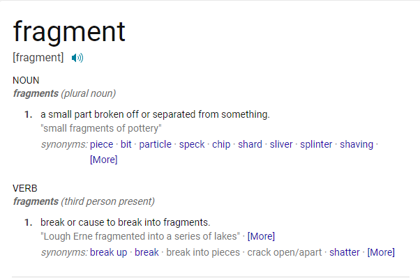 This week’s theme was titled “Fragments.” To get a basic understanding of the word, I found this definition on google which shows the noun and the verb meanings.