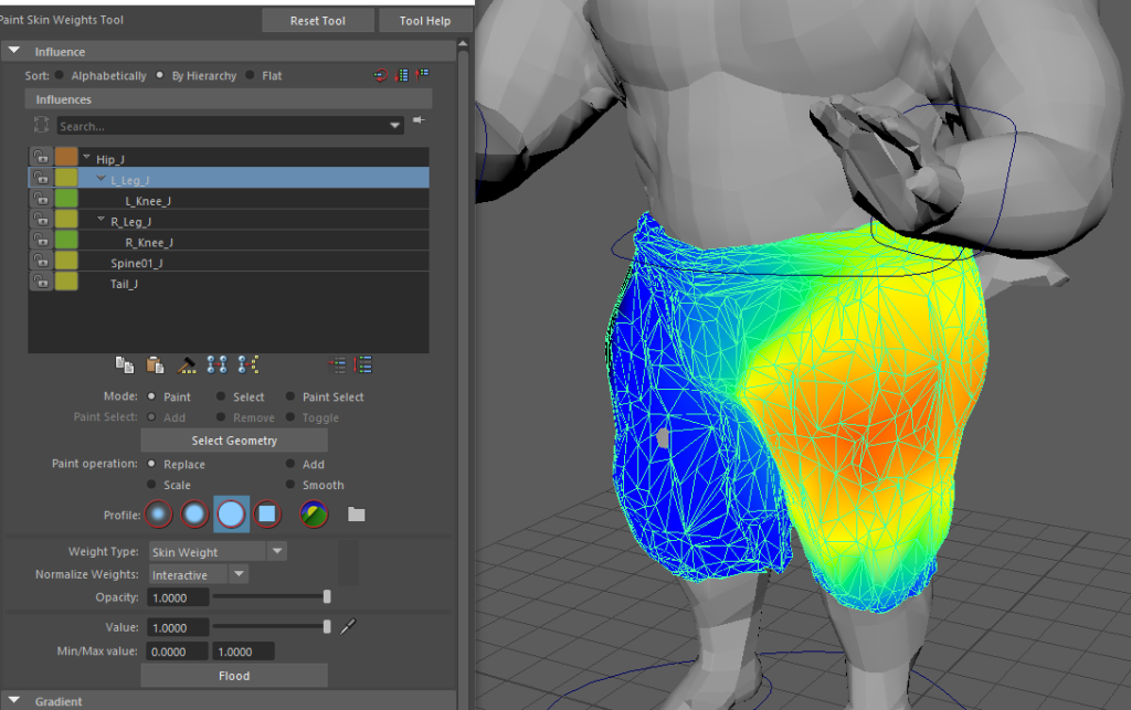 Since the character model had been created new, I had to rescale the trousers slightly so they would bind easier. Once they were wrapped to the main body skin weighting was then the next step.