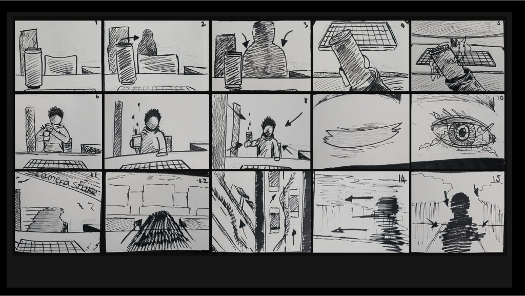 After constructing my storyboard, I decided to bring the imagery to life and create an Animatic for the project to get a greater understanding of the story with moving visuals. I made this within the software After Effects using shapes and the pen tool to build the assets, using my original storyboard as a reference.
