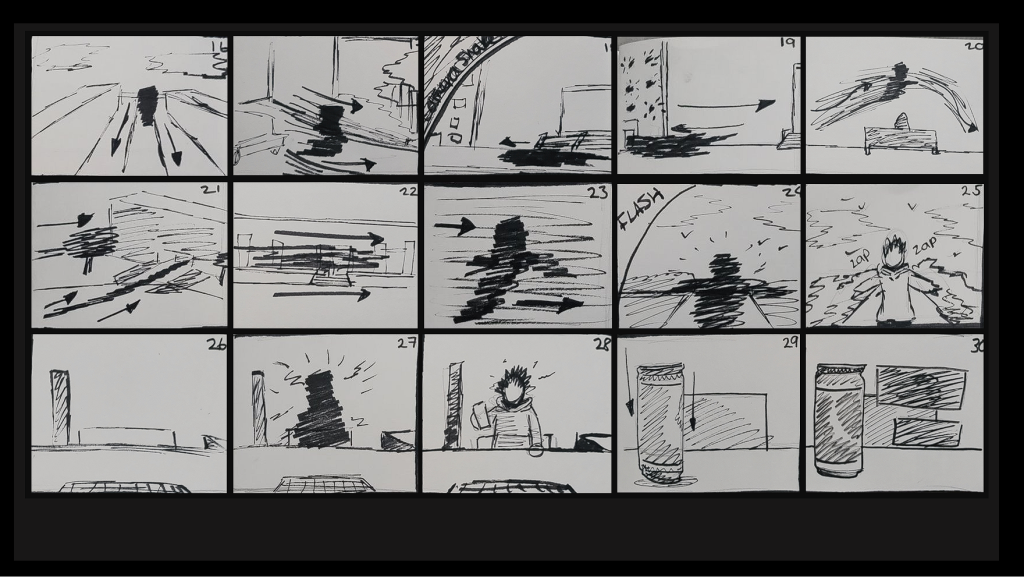 Here is my storyboard for the commercial, it’s been converted from my sketchbook onto Illustrator to be ordered and neatly presented. There are additions such as arrows and numbers to the storyboard, this is a way to help guide the reader showing them the direction the stories going and how things will move. I found from making the script, it has helped me visualize the image quite a bit, it has influenced my sketches greatly with accuracy to the story.
