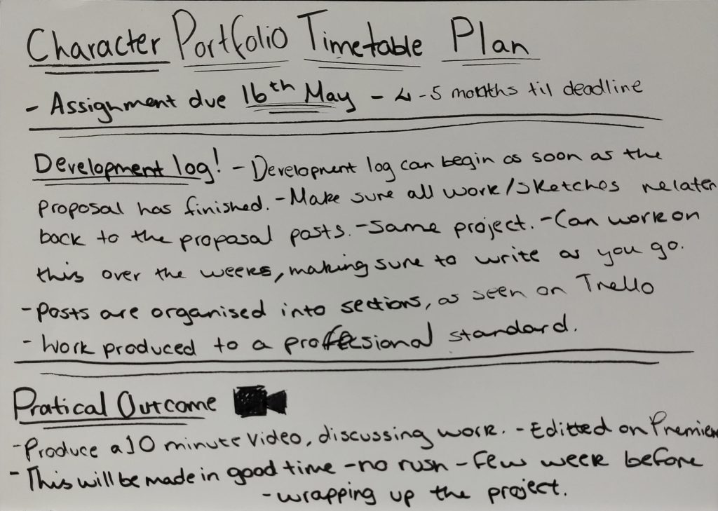 Taken from my sketchbook, I have constructed a short brief and plan for my timetable of what I need to do towards the assignment due date. These notes are great as a reference to look back at, I will definitely be using this as a guideline for the project’s progression path.