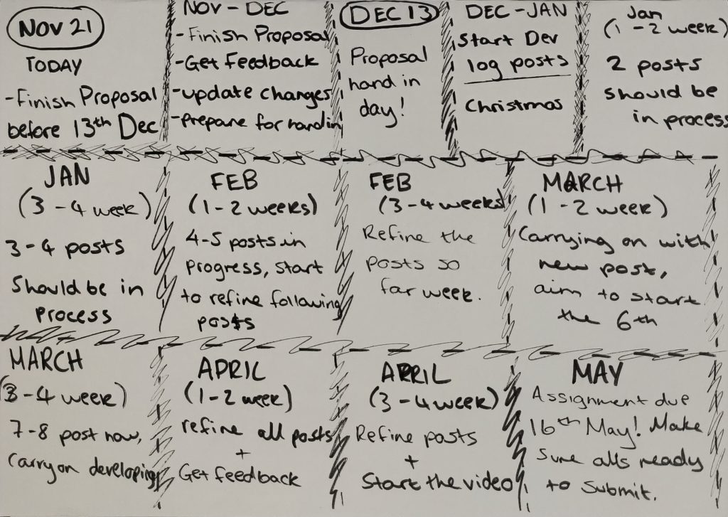 This is the timetable that I am going to follow for the rest of my project, this will be important as it will help me keep on track and focused on what needs to be done and by when. It also displays some of the deadline dates on the chart so I know how long I have left to produce the outcome.