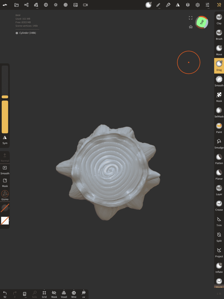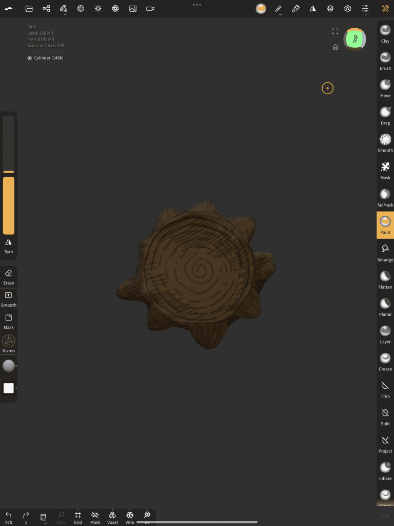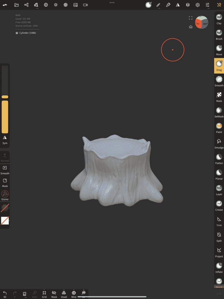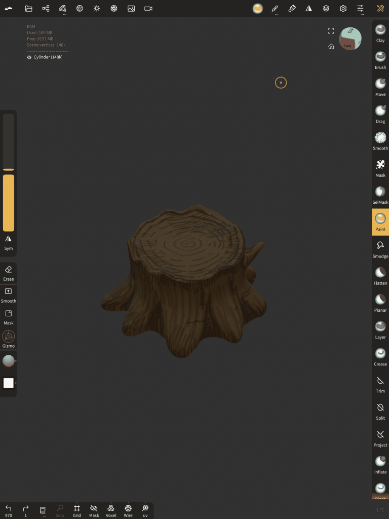 Starting off with the easiest, I thought making the stump would be a good way to warm up my 3D skills, to make this shape I began with a flattened sphere and added a cylinder to the mix, remeshing them both together. After combined into one object I dragged out areas of the bottom section, creating some sort of splash base shape, straight after I squashed/tucked in certain points of the actual main body to generate a deformity in the structure. Once happy I used the clay build-up tool and sub-divided a few layers on the surface of the model to make carvings, this gave the model depth and a surface texture. As soon as that was done, I opened up poly paint and used a variety of shades of brown to form tones.