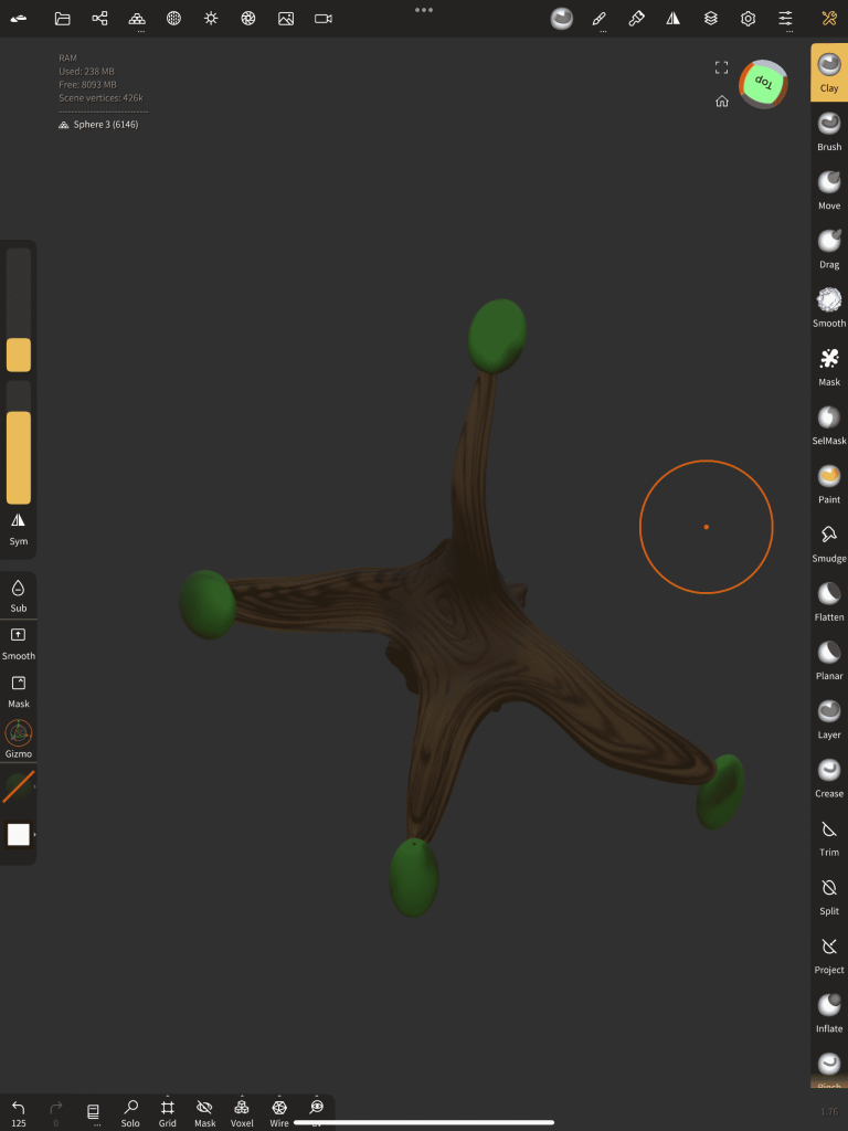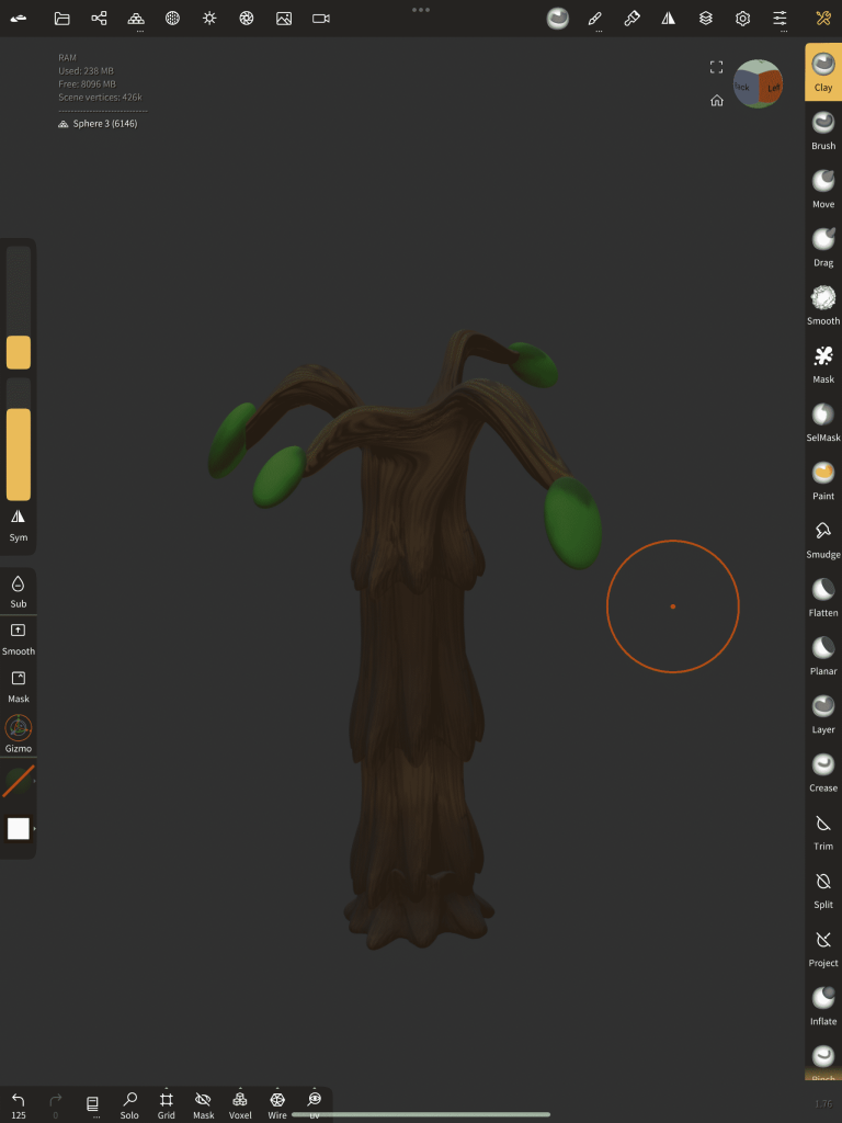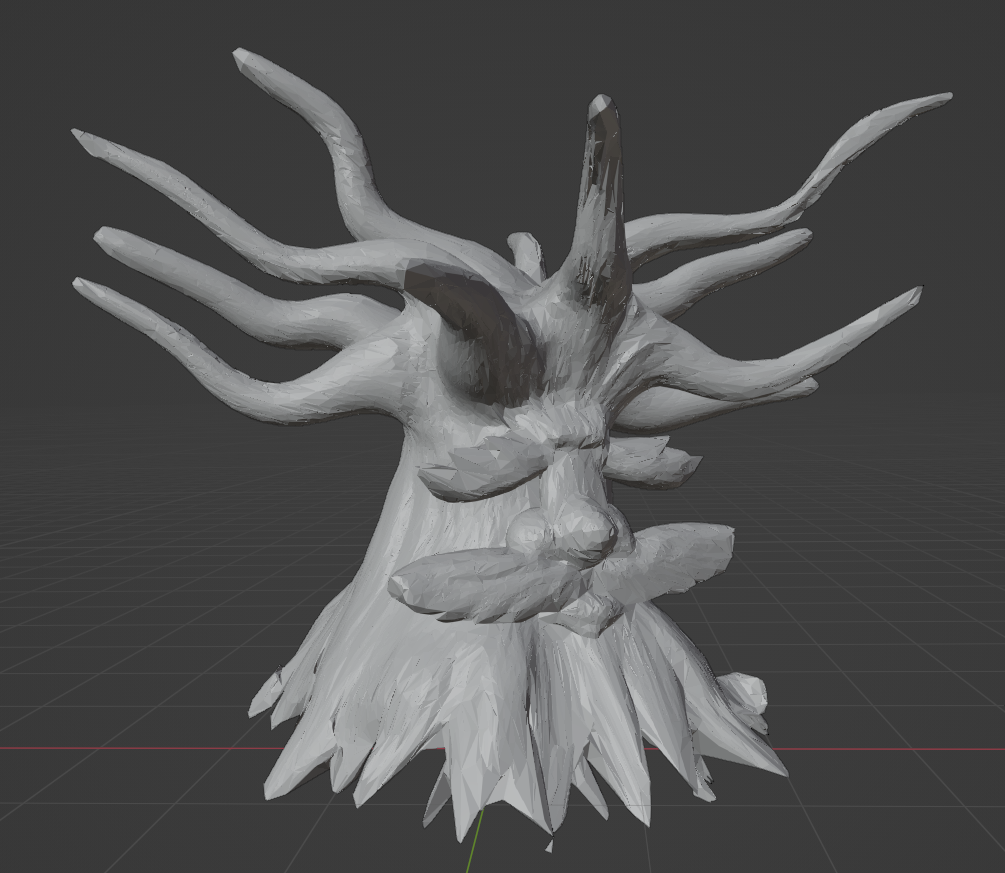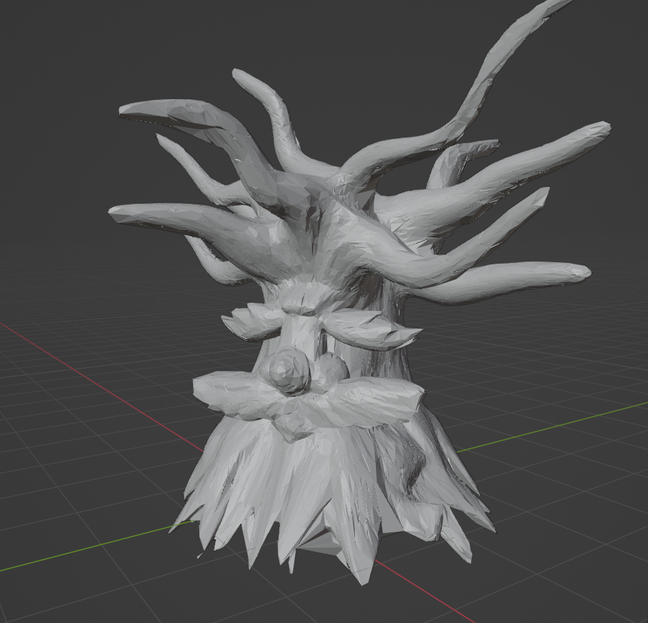 Modelling the body of this tree ended up being the most time-consuming out of the whole models, there were quite a few steps that I took to build the framework. To begin, I had a sphere and duplicated it 4 times dividing the body into sections, top to bottom. These spheres ended up going on separate layers and worked on being hidden from the rest to avoid overlapping, it was also done to target details efficiently. The shapes started to form as soon as the drag and chisel tool was in use, I ended up pushing and carving into the structure to get what I wanted, I did this for all sections. After I was happy with the bodies divisions I remeshed them all together into one and smoothed out the stitching. Once that was sorted, I added another couple of spheres to the model and warped them into facial features. The texturing for this model was a highly rendered poly paint, using tones of brown in guided strokes across the tree.