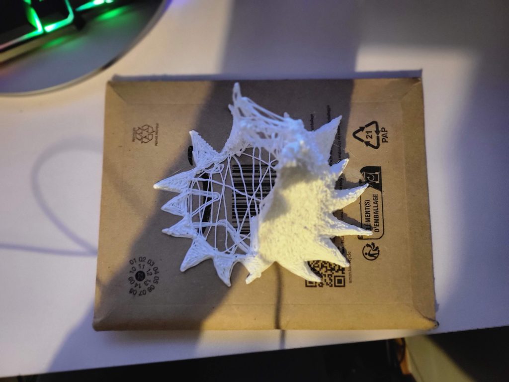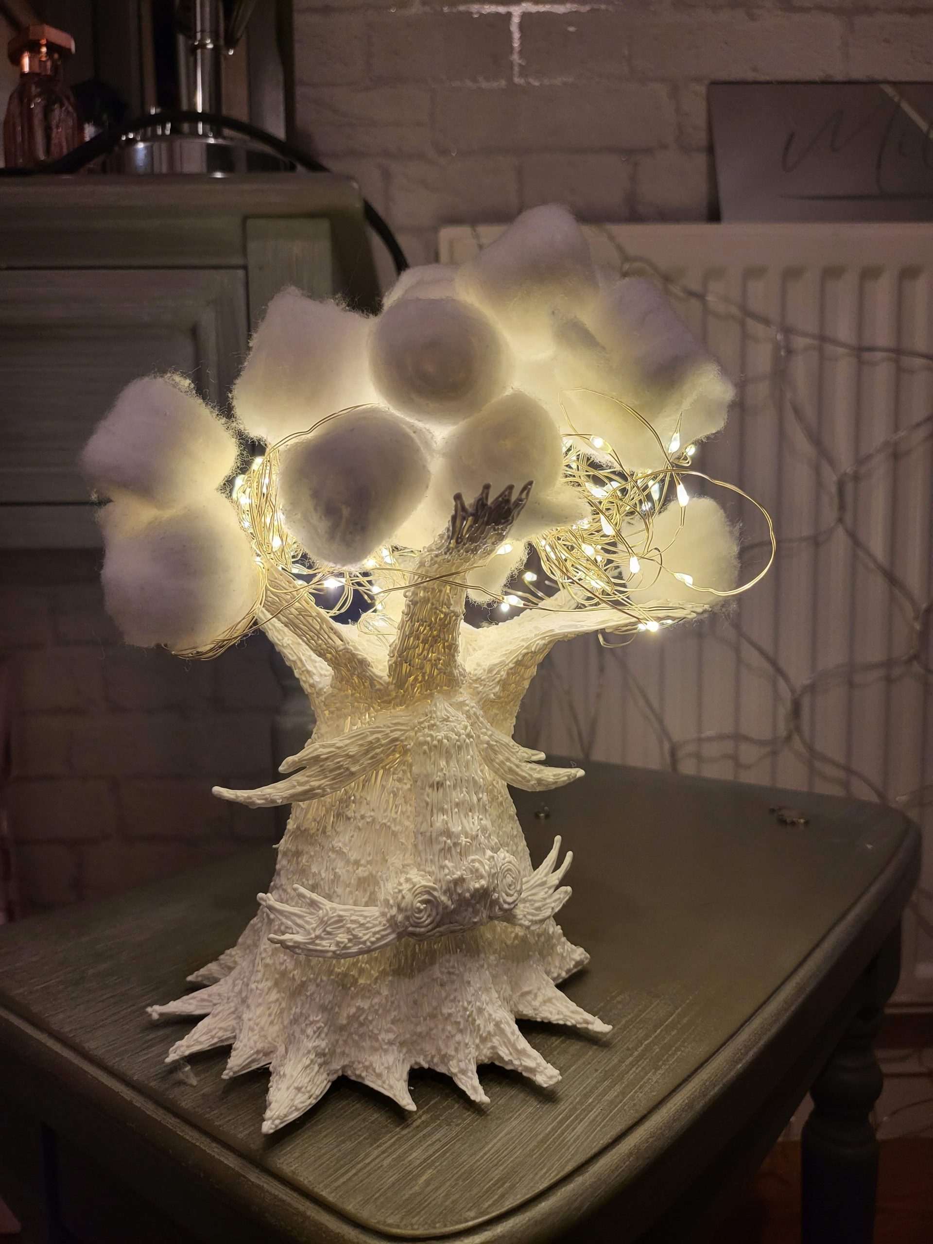 Here’s the result of the first working prototype built in person, I am quite fascinated by how this has turned out actually, I ran into a few problems with proportion and stability which caused the model to slightly deform but looking at it with the lights glowing definitely draws your eyes away with interest. The lights and the wires seem like they are almost dancing about taking the shape of the leaves in the first image. If I were to improve this prototype further, I would have maybe experimented with the face a lot more as there are no real features or emotions attached to it.