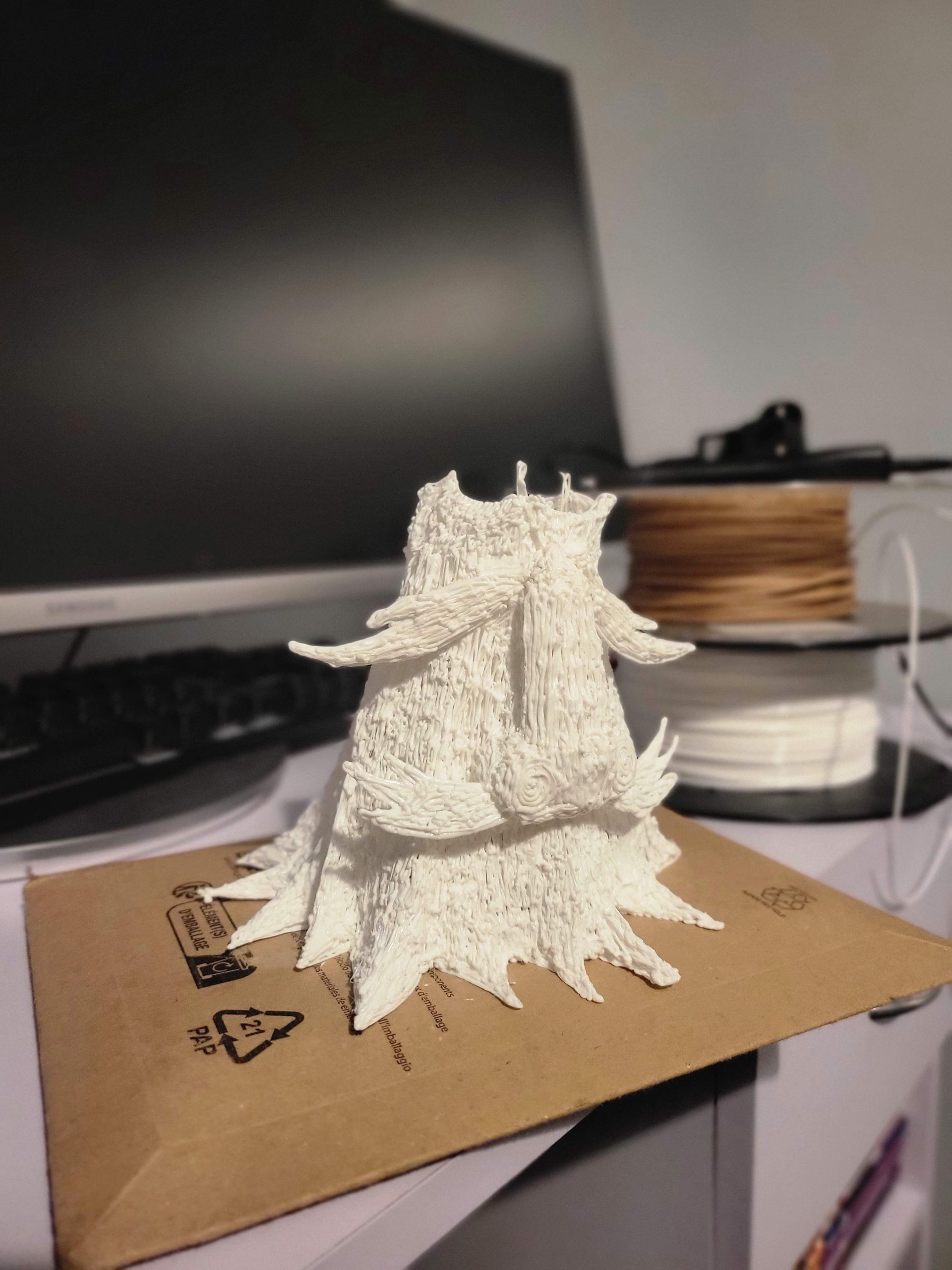 I didn’t really enjoy sculpting this one, I couldn’t seem to wrap my head around how the tree would actually pop up and where it was coming from/how to present it so I tried my best at doing it. To make this model I used a number of 4 cylinders layered on top of each other, remeshed. After that was done I began to warp the structure making it seem droopy and wood-like. The textures applied after this definitely supported the deformities, generating patterns all along the body having an appearance of varnish wood I think.